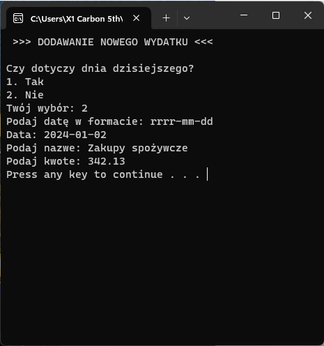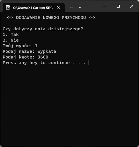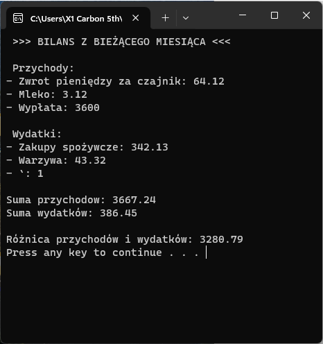 Aplikacja pomagająca kontrolować budżet osobisty dla wielu kont na jednym urządzeniu. Pozwala dodawać przychody i wydatki z wybraną datą oraz wyświetla bilans z wybranego okresu czasu.