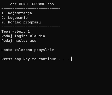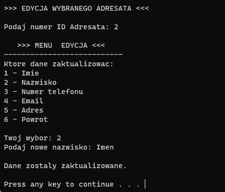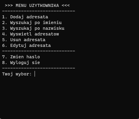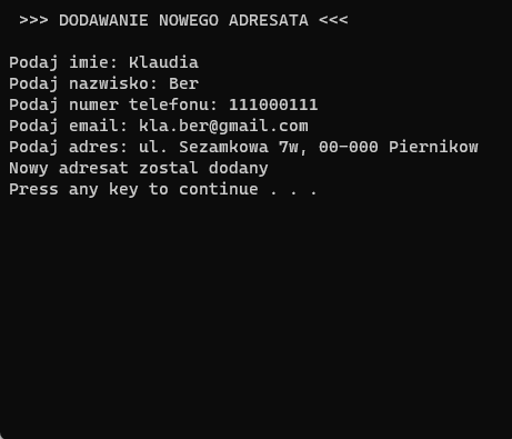 Jak nazwa wskazuje, jest to aplikacja stworzona na wzór dawnych książek adresowych. Posiada panel rejestracji użytkowników, dzięki temu na jednym urządzeniu można mieć kilka różnych kont. Po poprawnym zalogowaniu się istnieje możliwość dodania nowych adresatów, wyszukania ich po imieniu lub nazwisku, wyświetlenie wszystkich kontaktów, a także ich usunięcie i edycja. Adresy i użytkownicy zapisywani są w pliku tekstowym w folderze z aplikacją. Nie posiada interfejsu graficznego, obsługiwana jest w konsoli jak widać na poniższych zdjęciach.