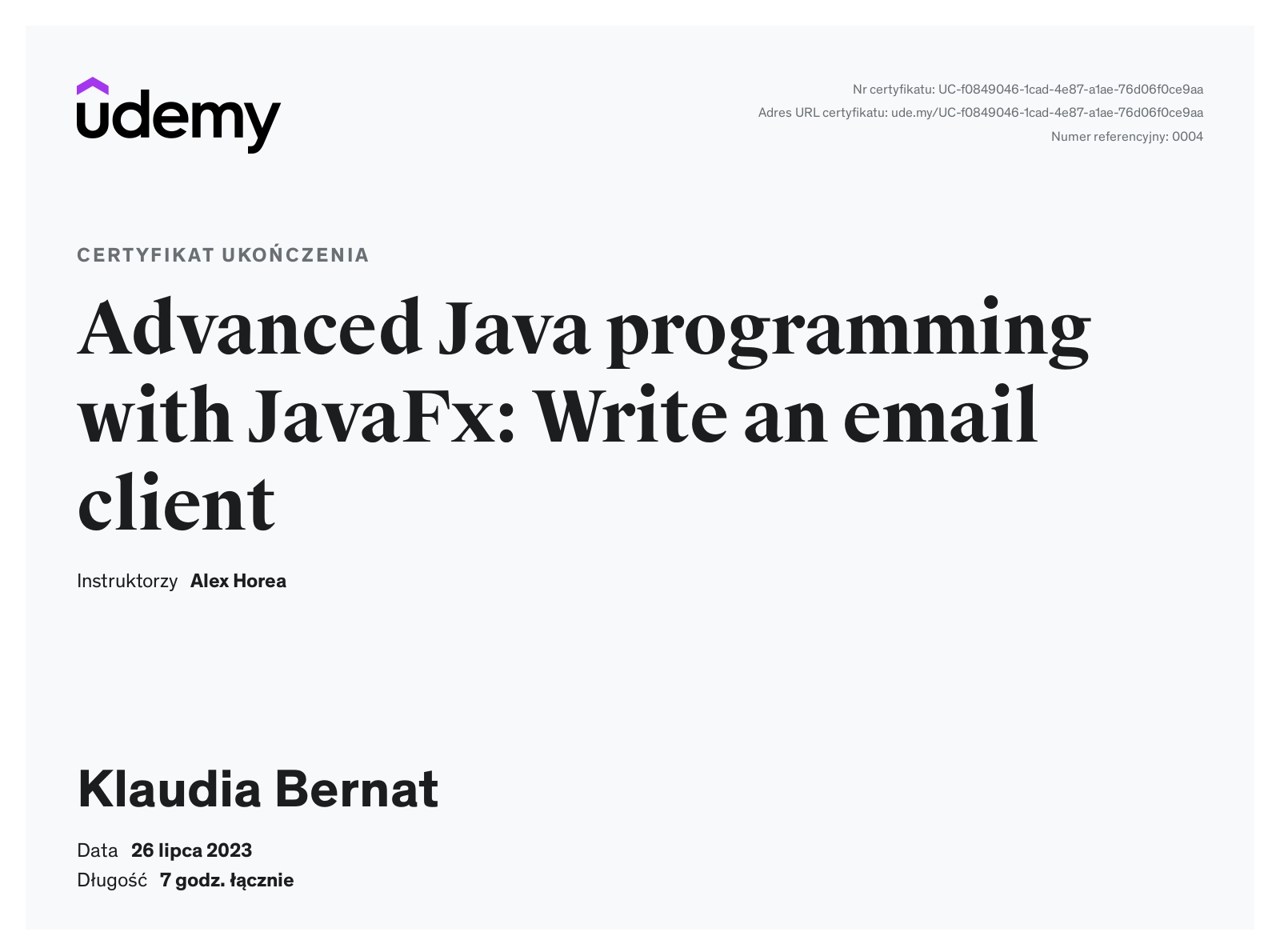 Następnym wyzwaniem było napisanie aplikacji pogodowej w języku Java, która pobiera dane z API OpenWeatherMap. Projekt zbudowałam przy pomocy Maven, a interfejs graficzny stworzyłam w JavaFX. Dodatkowo zapoznałam się z testami jednostkowymi i napisałam je przy pomocy jUnit, Mockito i WireMock.