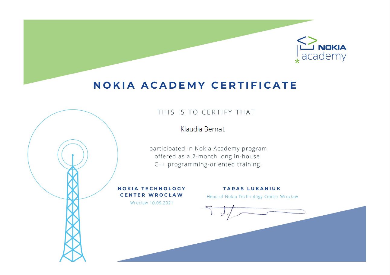 Dołaczyłam wtedy do programu Przyszły Programista i moja nauka ruszyła z kopyta. Na pierwszy ogień poszedł C++, algorytmy i programowanie obiektowe. Czułam się w tym języku na tyle dobrze, że zaaplikowałam do udziału w Akademii Nokii, na którą się dostałam i którą udało mi się ukończyć.